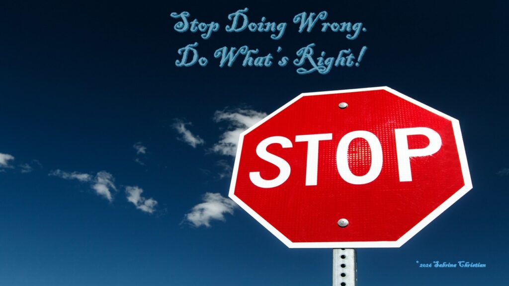 God asks for our obedience, to do what is right (Micah 6:8). Therefore, any move away from God, any action counter to God’s will, any word that dishonors God, is wrong. As I mentioned in Job Description: My One Duty as Assigned, God has shown us what is right in 600+ commandments. The ten commandments provide a summary. And Jesus’ response when asked what the greatest commandment is makes it even more simple for us to stop doing wrong: we must love God and our neighbor (Matthew 22:37-39).